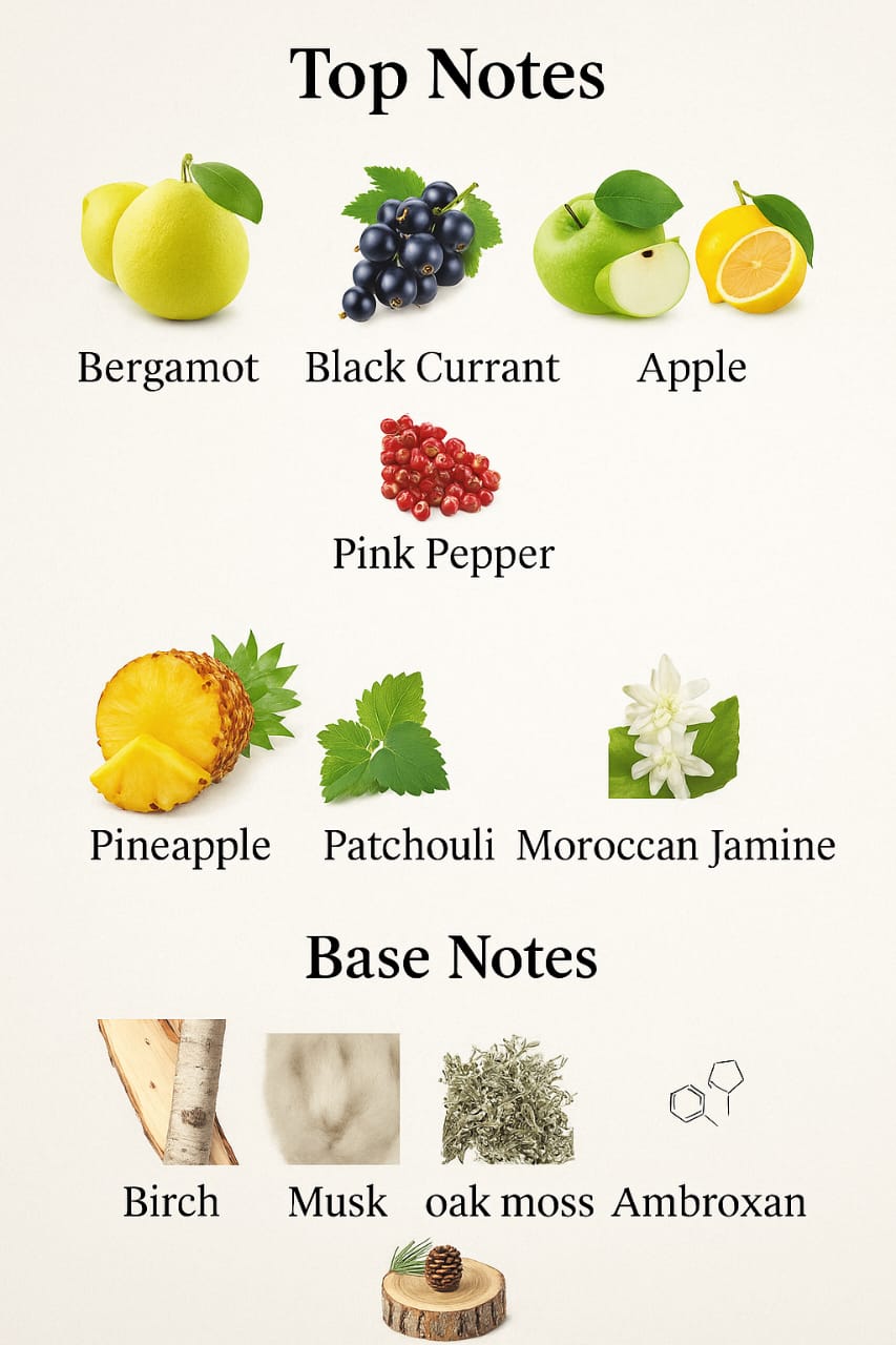 At its heart lies a harmonious blend of rose, jasmine, birch, and patchouli, evoking both elegance and depth. The dry-down is powerfully masculine — enriched with oakmoss, ambergris, vanilla, and musk — delivering long-lasting warmth and sophistication.